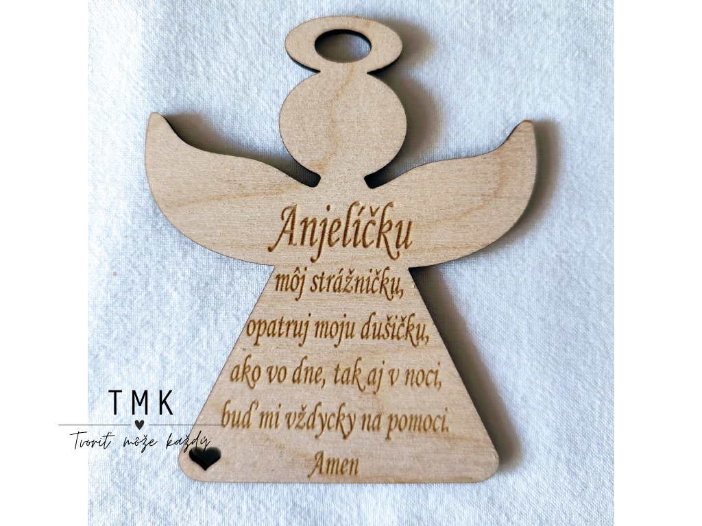 Krásna modlitba Anjelíčku môj strážničku vygravírovaná na drevenom výreze v podobe anjela.