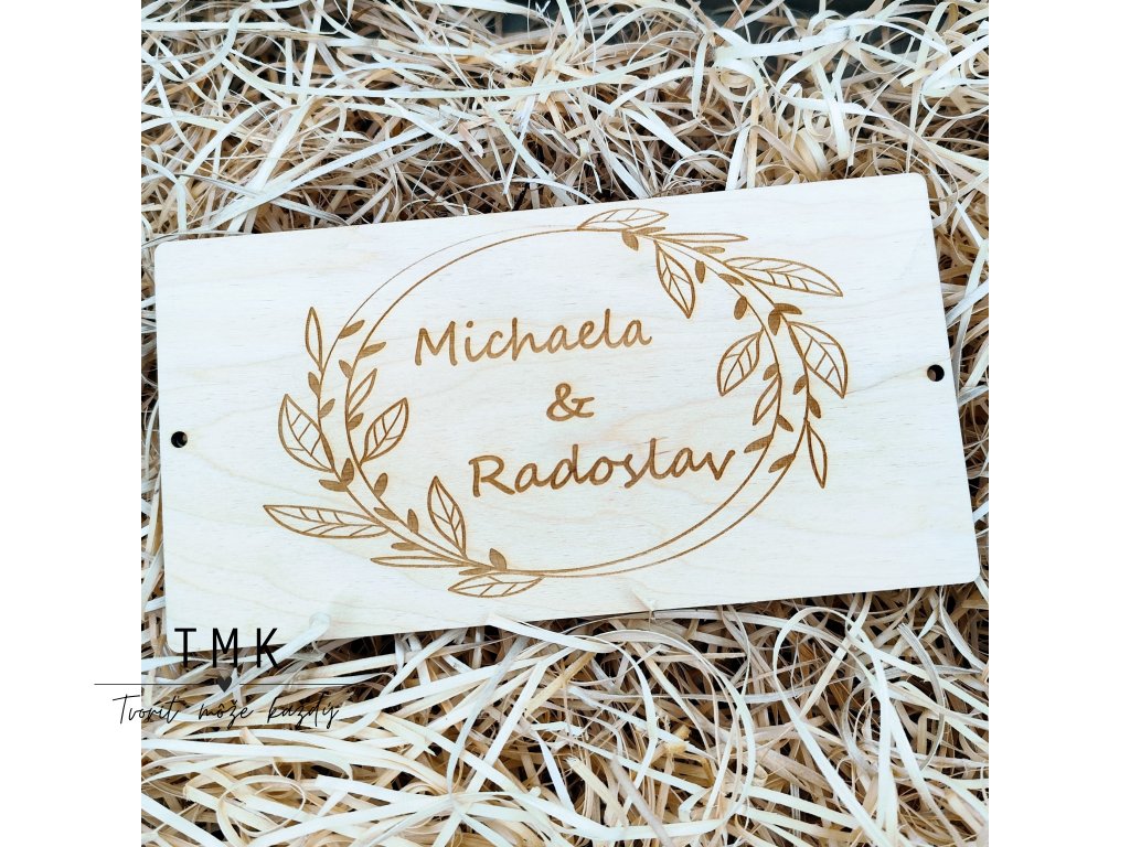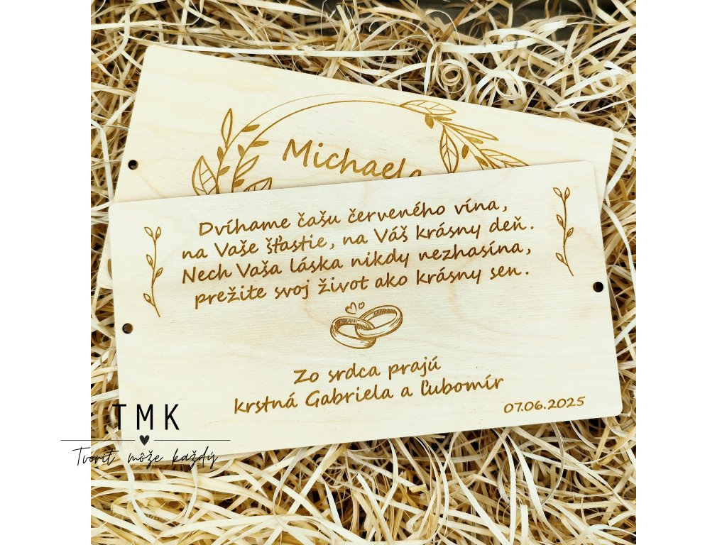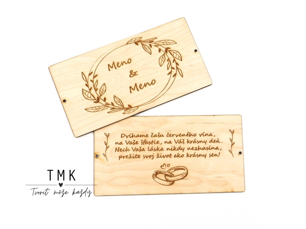Elegantná drevená obálka určená na originálne a štýlové darovanie peňazí novomanželom.