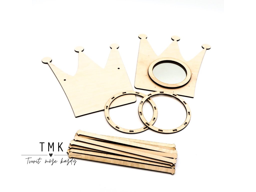 Variant KORUNA + ZRKADIELKO obsahuje 2x dno v tvare kvetu, 2x lištu na prilepenie osnov, 11kusov paličiek (osnov) na vypletanie a krycia lišta. Krycia lišta slúži na prichytenie zrkadielka ale má aj estetickú funkciu - lišta zakryje hrany zrkadla. Stojan s krycou lištou tak bude pôsobiť esteticky a kompaktne.