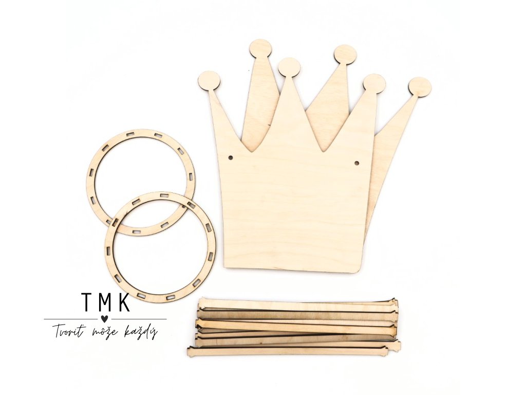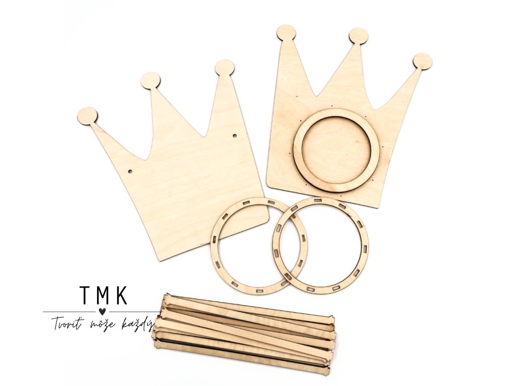 Variant KORUNA obsahuje 2x dno v tvare kvetu, 2x lištu na prilepenie osnov a 11kusov paličiek (osnov) na vypletanie.