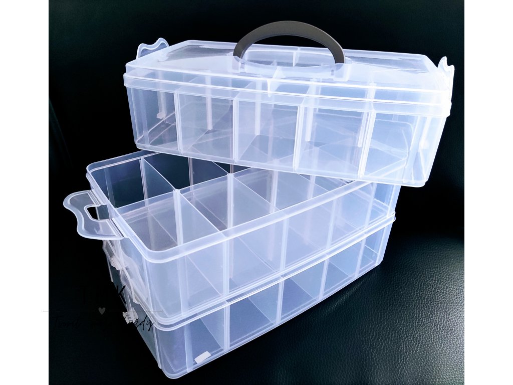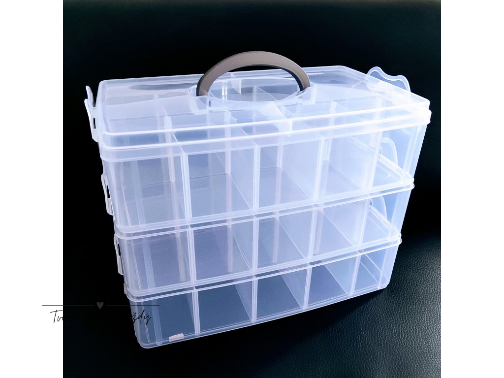Praktický priehľadný plastový box vám ponúka tri poschodia na uloženie všetkých drobností potrebných k tvoreniu.