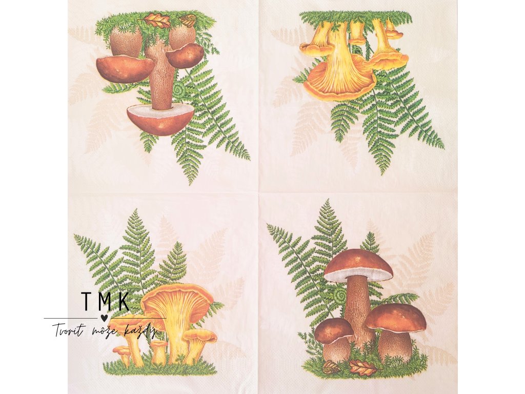 Servítka s motívom húb. Vhodná na decoupage (servítková technika), ktorú viete použiť na naše dná a vytvoriť tak jedinečný košík.